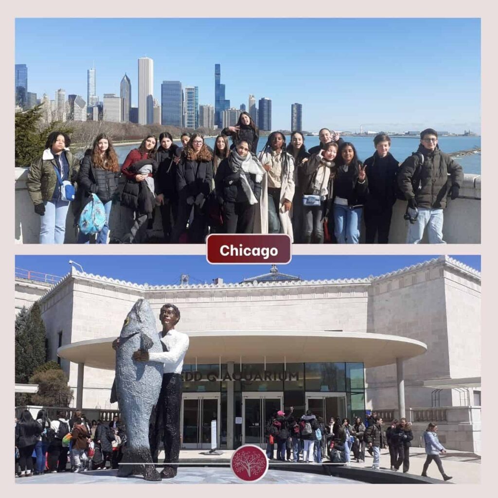 Ce sont 16 élèves français qui ont eu la chance de vivre une immersion de 12 jours dans des familles américaines, du 3 au 15 avril 2025. Ce séjour leur a permis de s’immerger dans le quotidien de leurs correspondants, de pratiquer l’anglais, et de découvrir les multiples facettes de la ville de Chicago : ses musées, ses quartiers emblématiques, son architecture vertigineuse, ses parcs et ses équipes sportives légendaires.